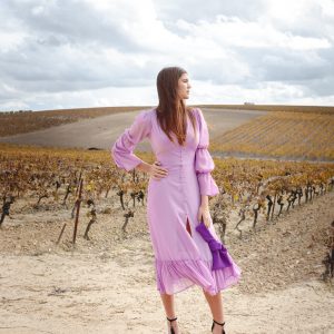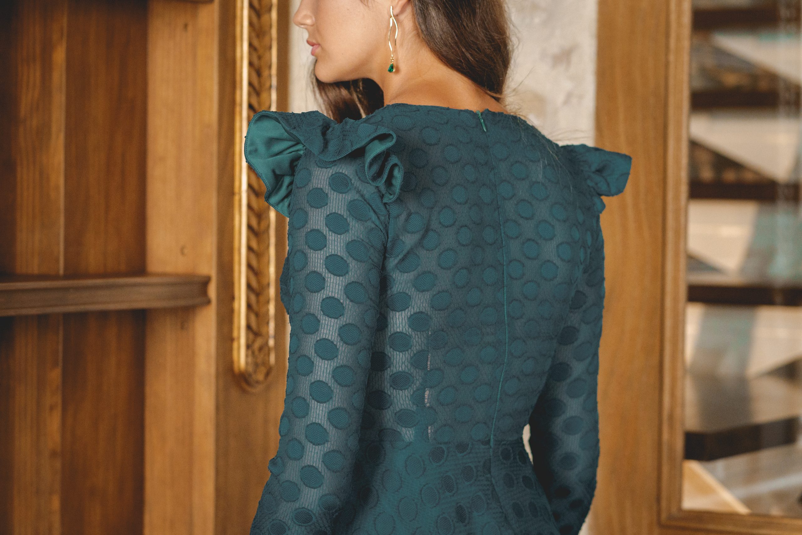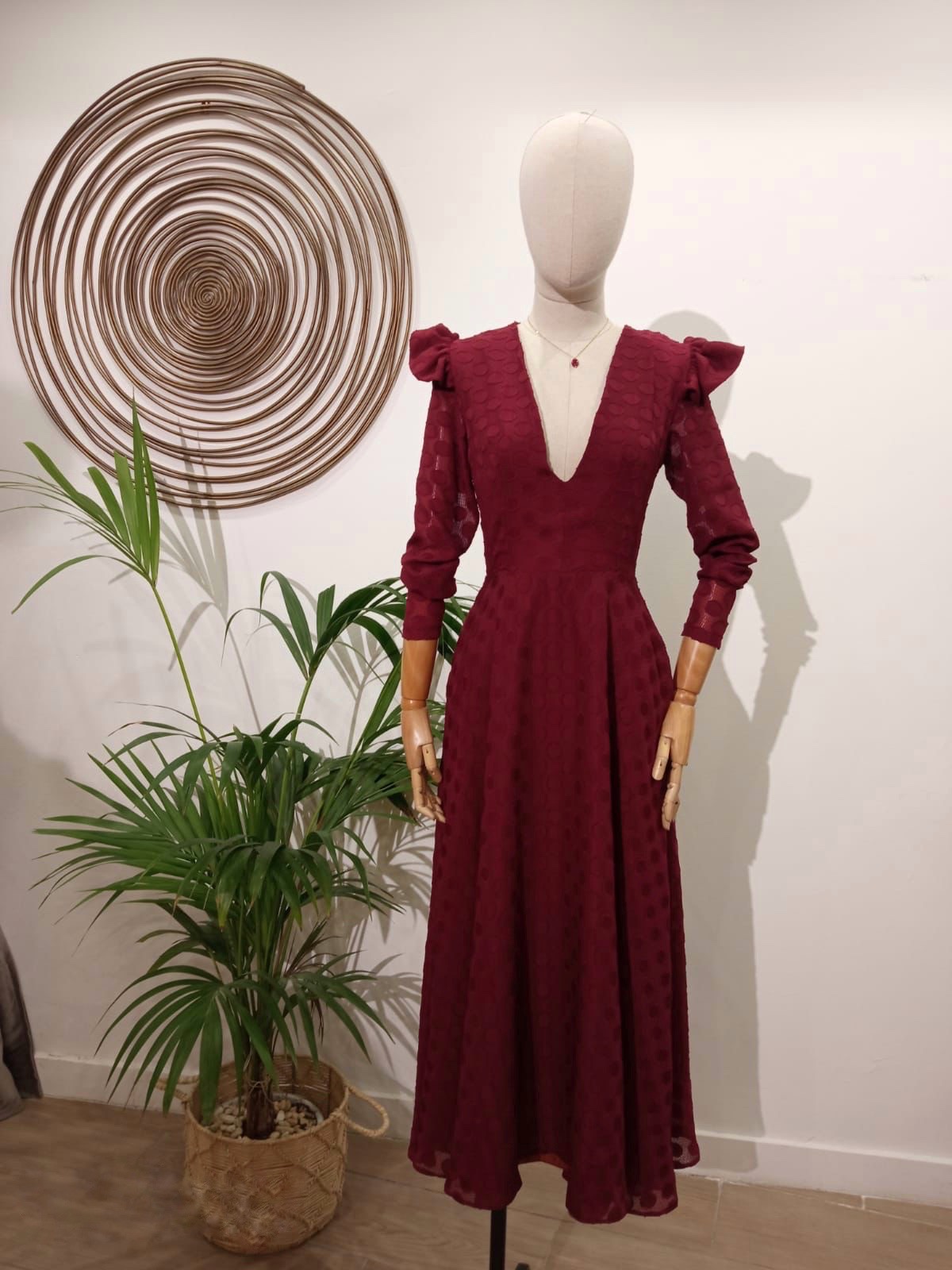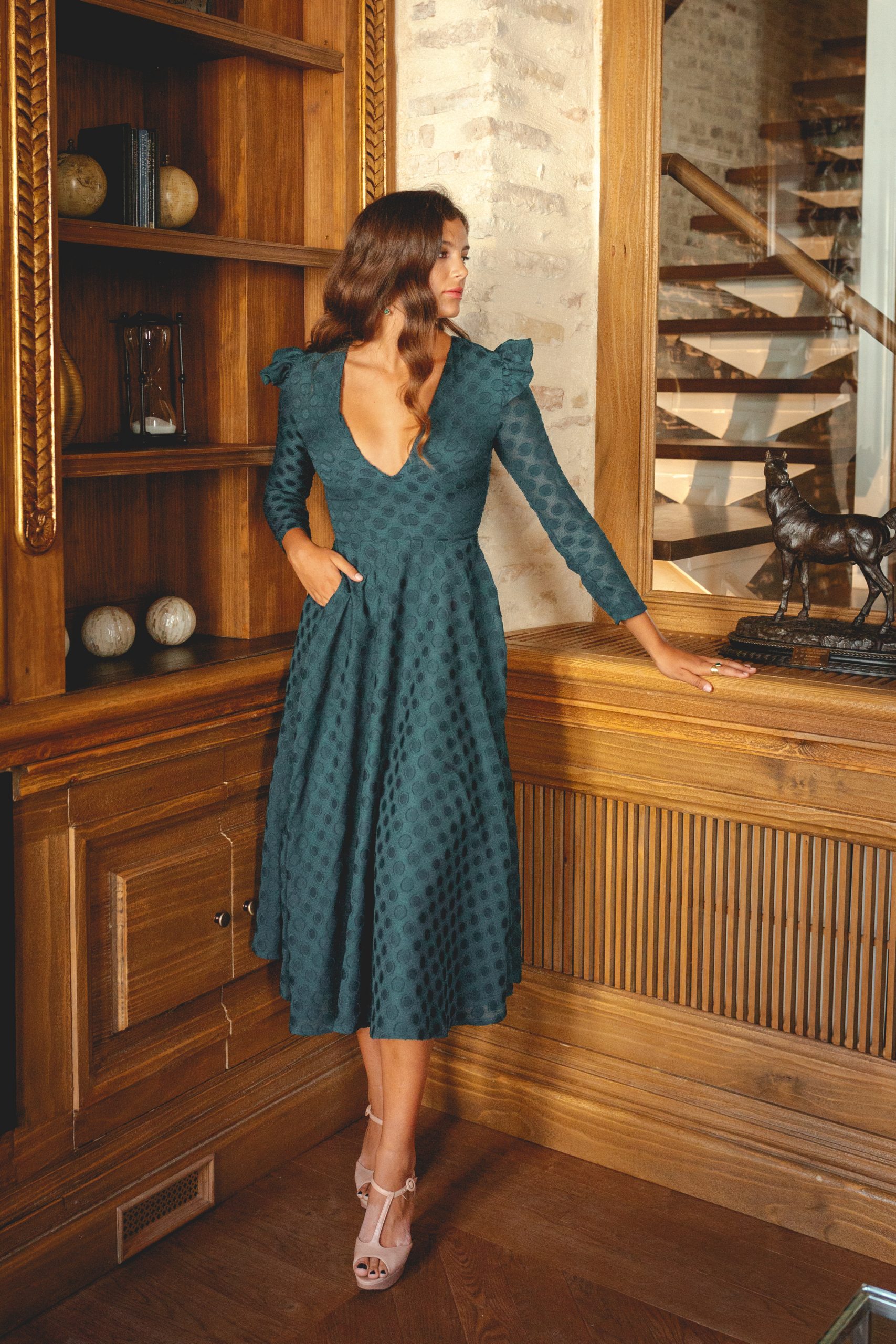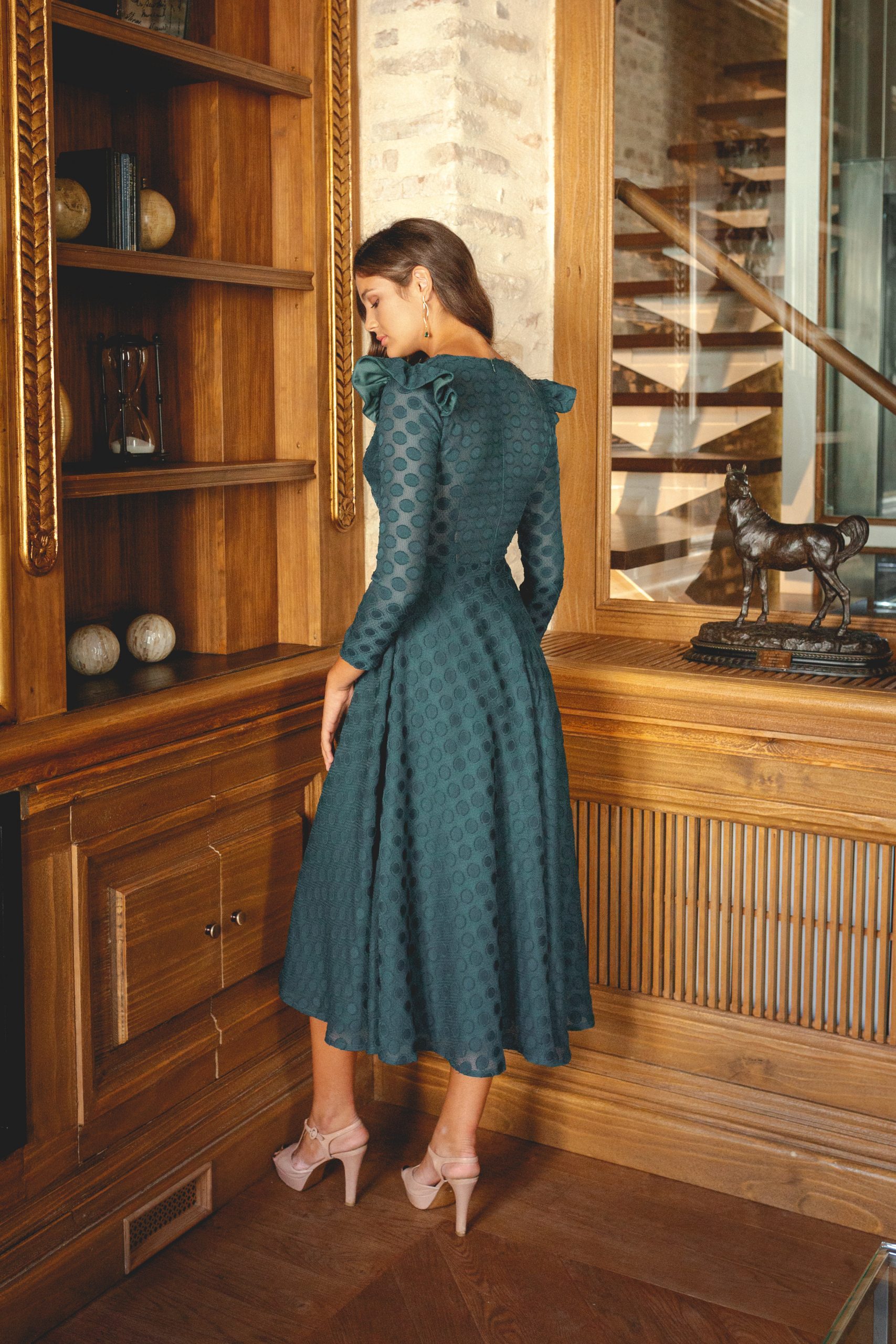 Vestido de corte midi con falda de vuelo cortado a la cintura, escote de pico y manga larga con detalle de volante en el hombro.