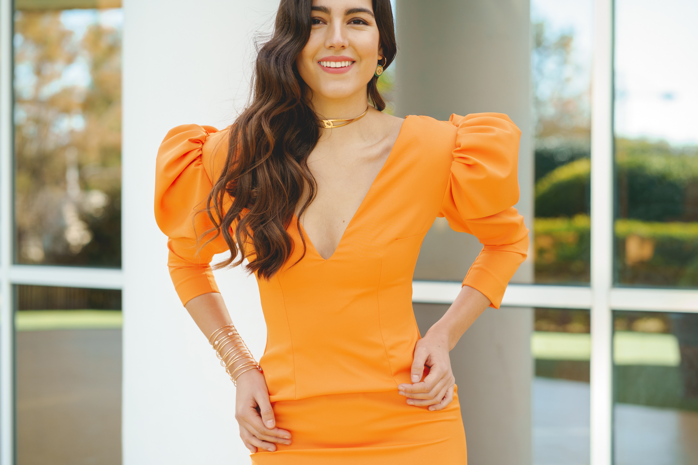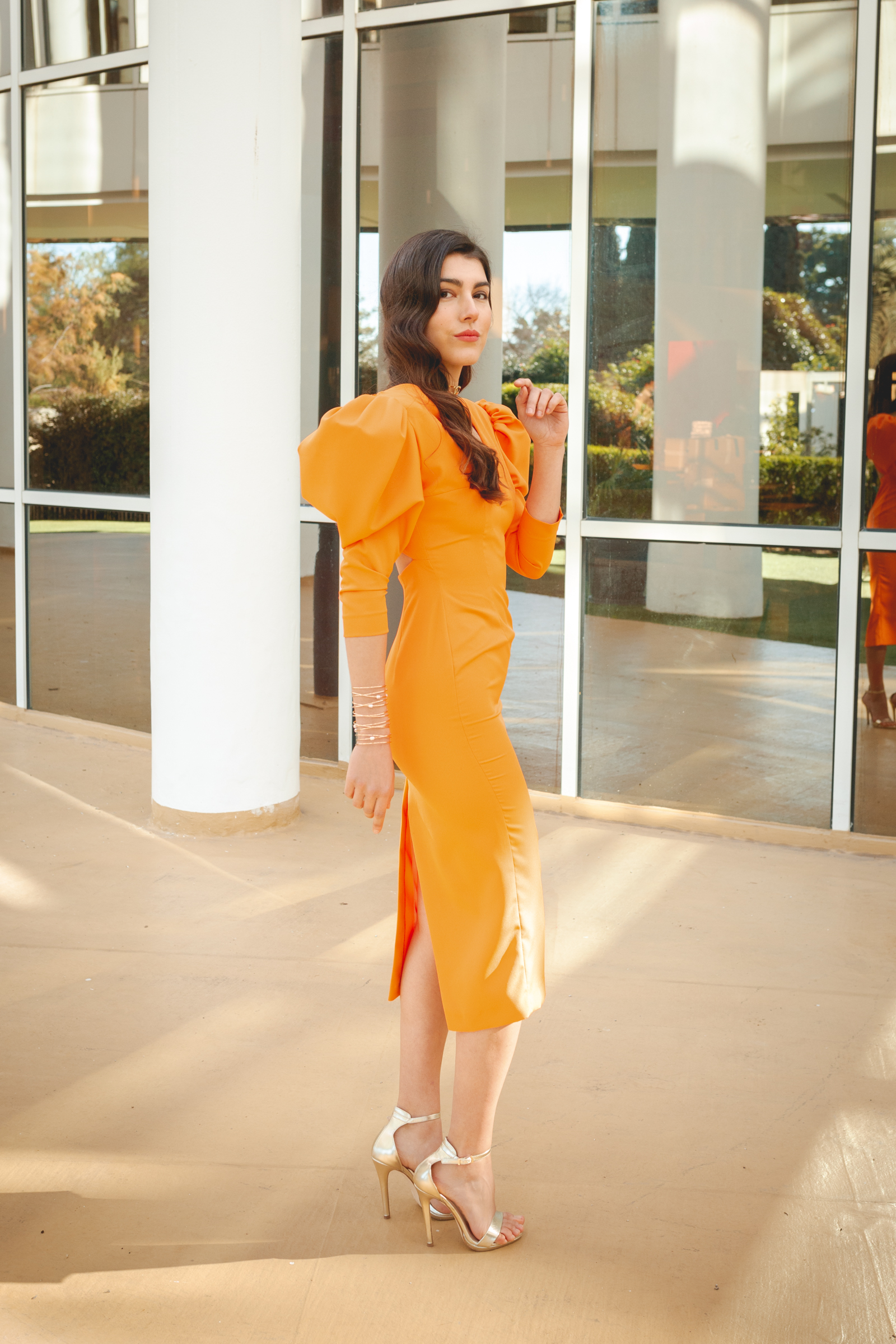 Vestido ajustado de largo midi con escote de pico, mangas abullonadas con frunce, y espalda en forma de lazo.