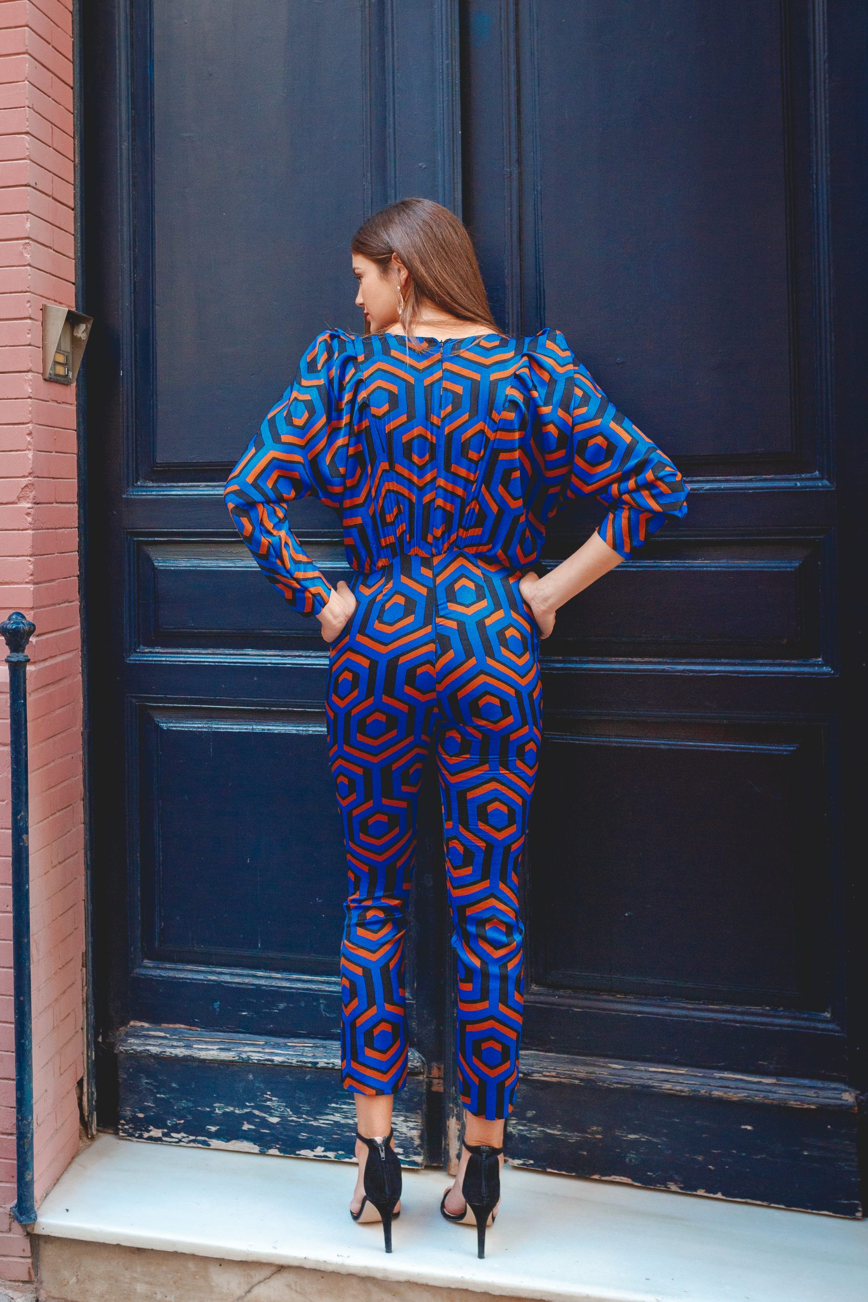 Mono enterizo de pantalón ajustado. Escote pronunciado en forma de V y mangas murciélago con tablas añadidas. Cierre total con cremallera en espalda.