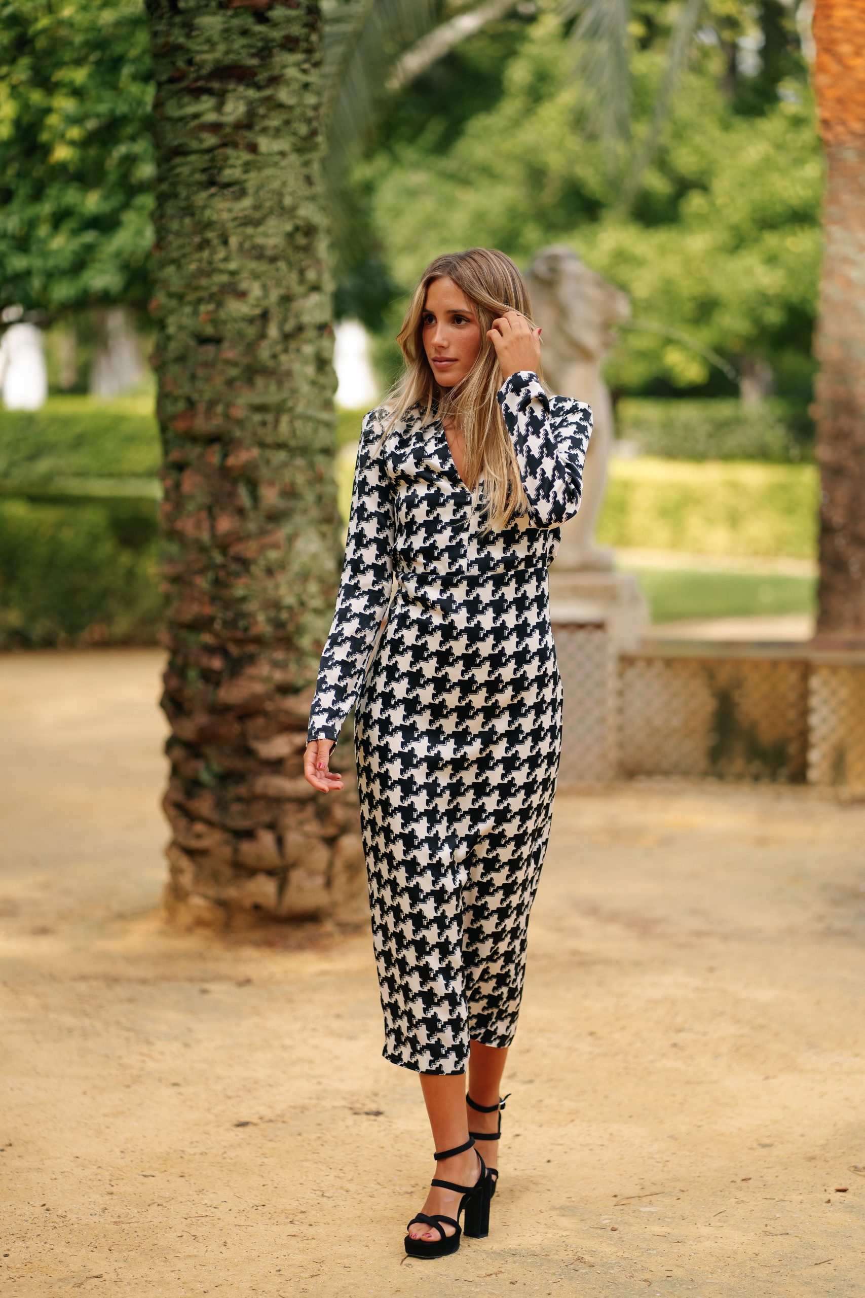 Vestido de largo midi, falda entubada y escote en forma de V. La espalda es descubierta con una lazada para anudar. Hombros tableados y mangas largas.