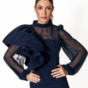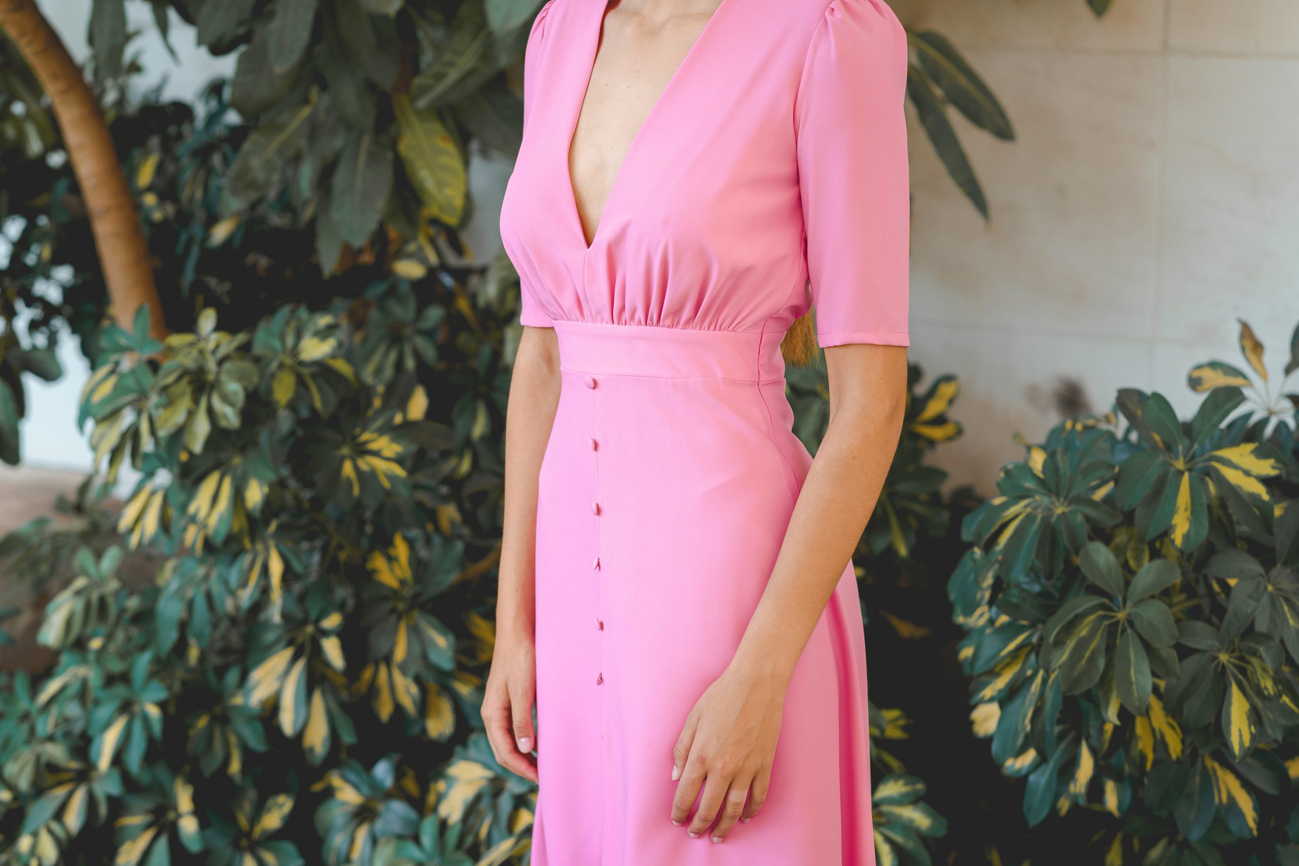 Vestido de largo midi y mangas cortas, cortado en cintura. Falda tipo evasé con abertura central y botones. Parte superior con escote de pico y fruncido.