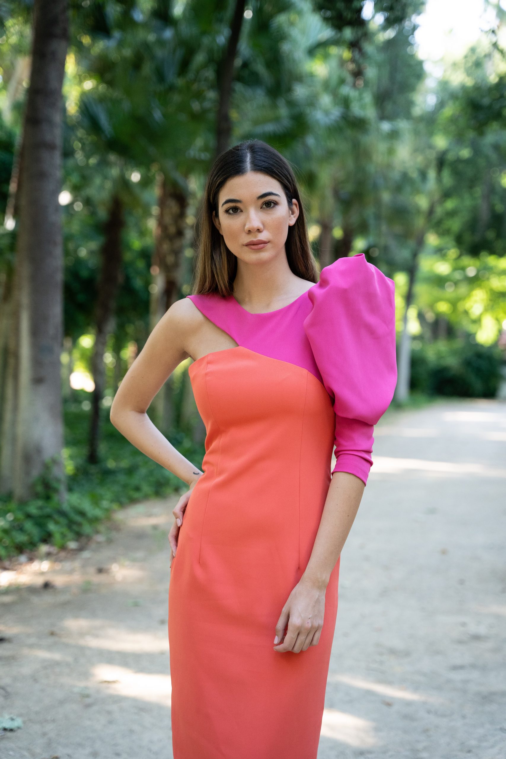 Vestido de largo midi ajustado, con mangas asimétricas y combinación de colores, coral y fucsia. La única manga que presenta es bastante abullonada.