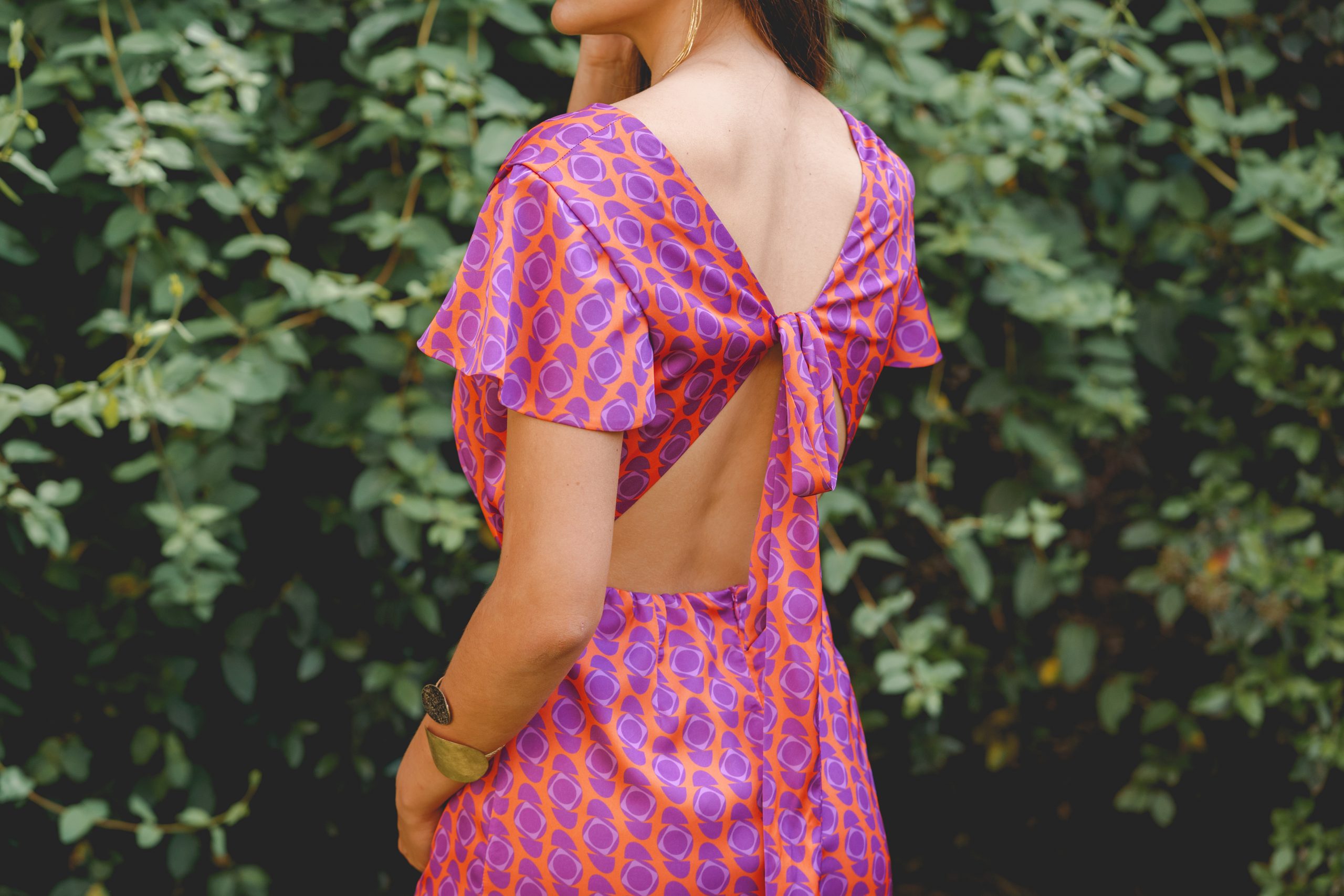 Vestido de largo midi, falda entubada, escote pronunciado en forma de pico, mangas cortas y espalda abierta con lazada para anudar.